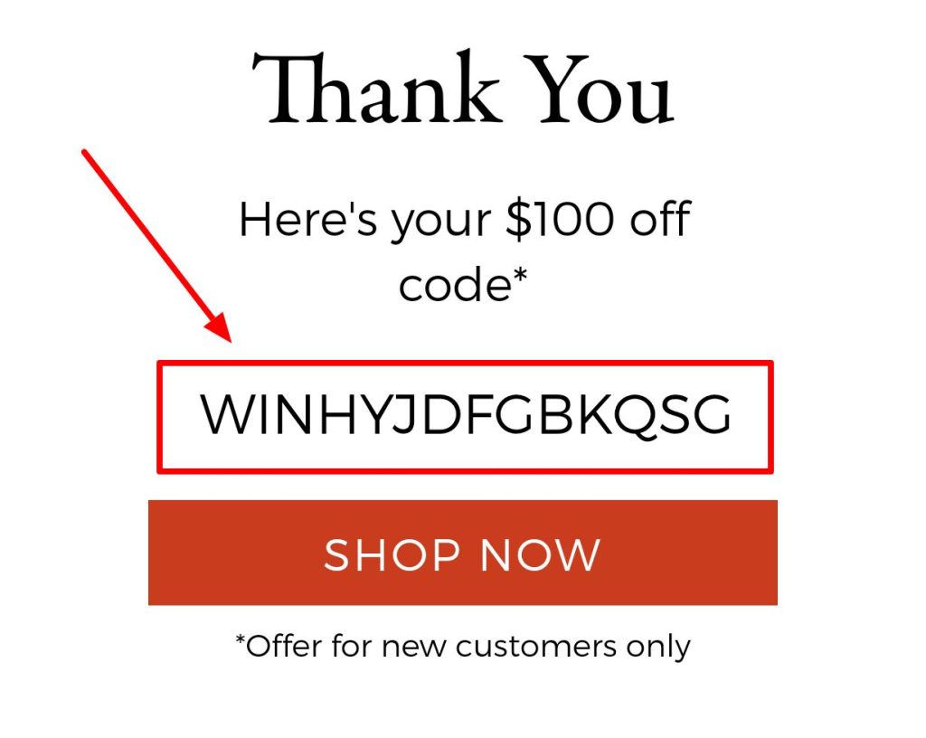 Once you see the popup, enter your email address and you should immediately receive your $100 discount code on that same screen (and also in an email).